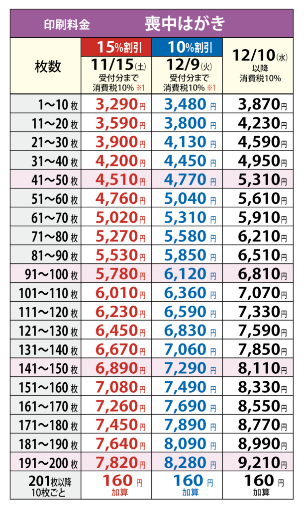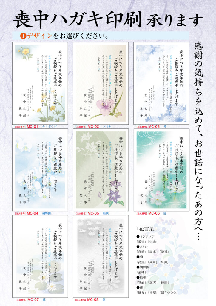 喪中はがきのご注文を承ります。上品なデザインと読みやすい挨拶文をご用意。デザイン選択・文章選択・枚数決定の5ステップで簡単。料金表・申込書PDFも公開しています。FAX・メールでお気軽にお申し込みください。